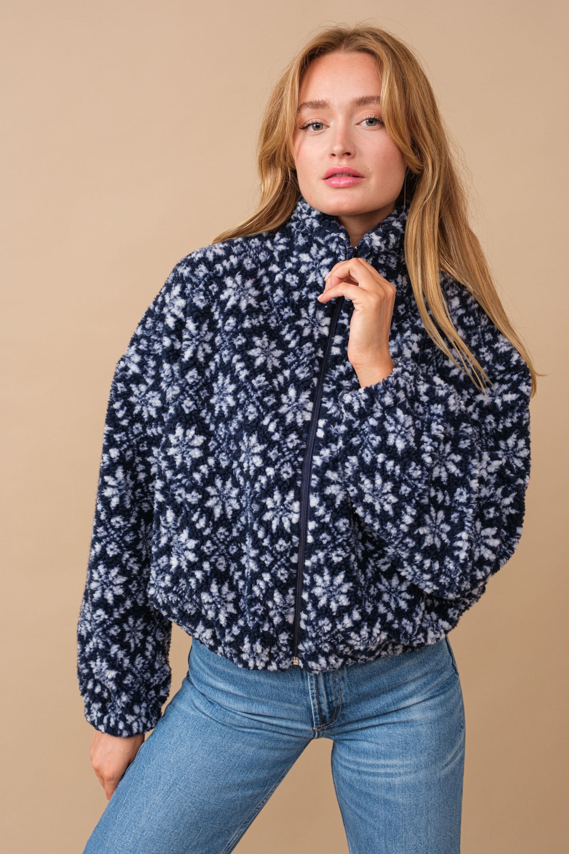 Snow Pattern Shearling Zip Up Jacket High Neck Zip up front Elastic Hem Pockets Full Lining 100% Polyester