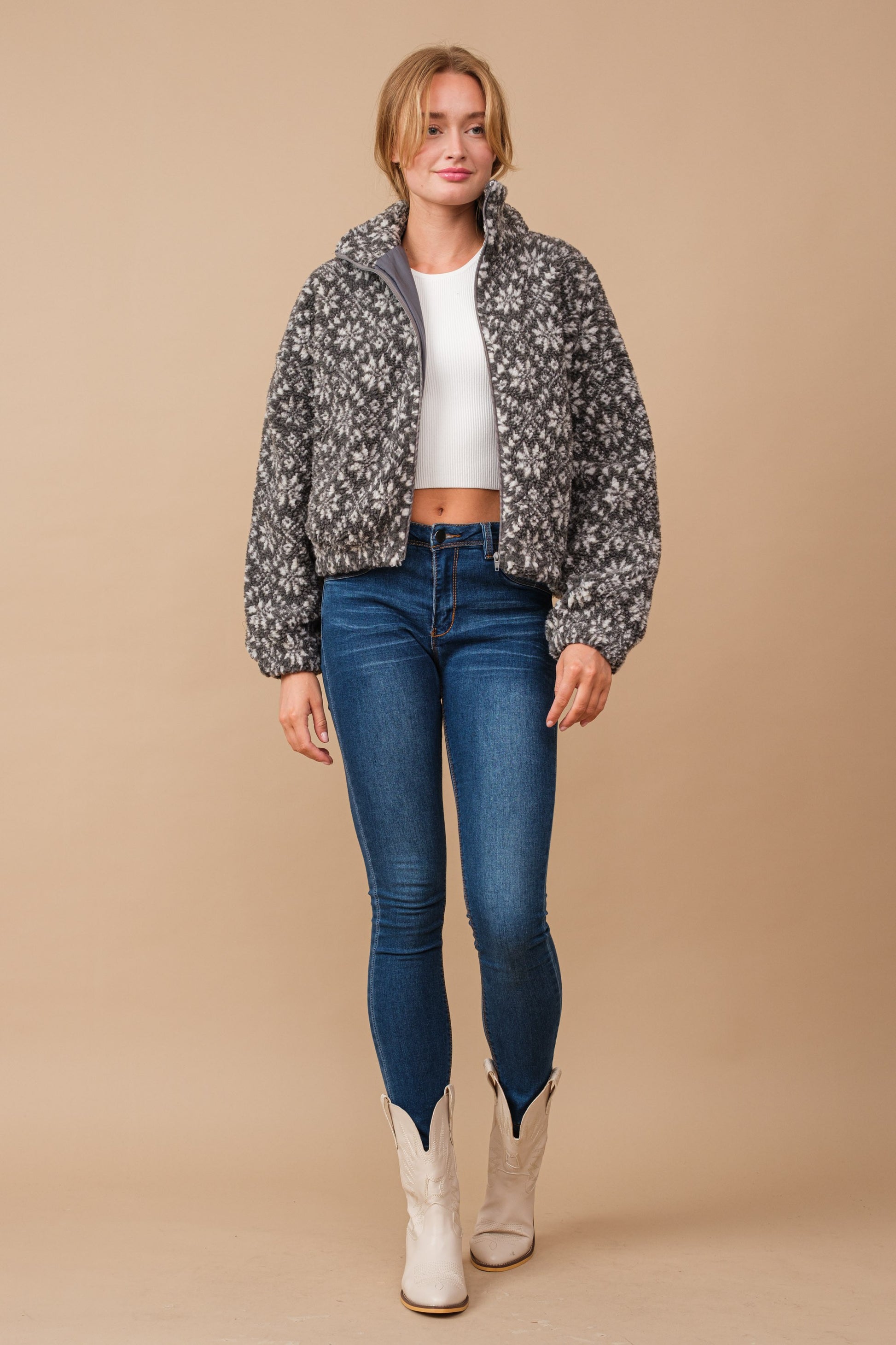 Snow Pattern Shearling Zip Up Jacket